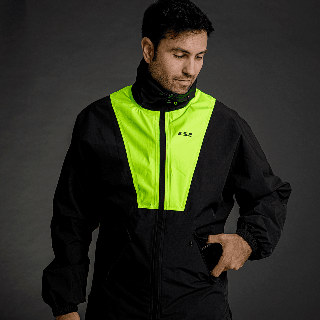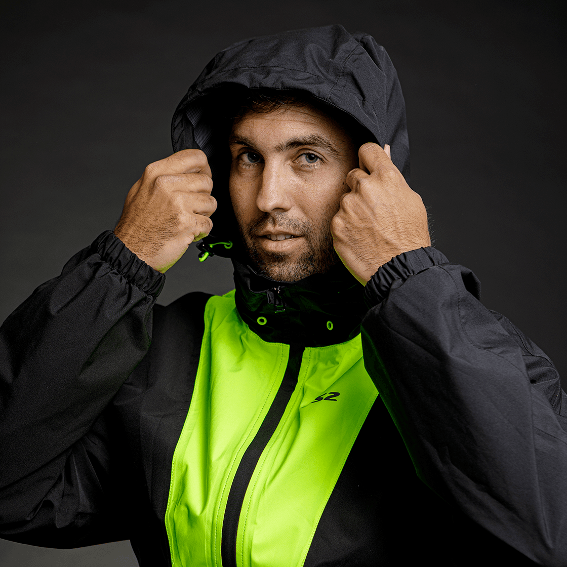 Chaqueta ligera impermeable antilluvia. Comodidad y adaptación perfectas gracias a sus correas de ajuste en la cintura. Con cuello alto para crear una protección efectiva contra el viento y capucha plegable antilluvia.